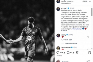 埃里克·加西亚社媒写道:“欧冠梦想与我们擦肩而过,这支球队值得拥有更多,我们已经拼尽全力,一度触手可及,但最终未能如愿。”